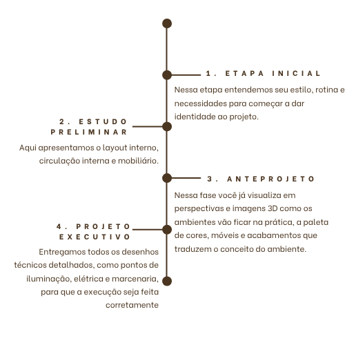 Nele são definidos a disposição dos móveis, cores, acabamentos, iluminação, pontos elétricos e todos os detalhes que fazem a diferença no dia a dia.