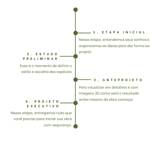 Nele definimos a escolha das espécies vegetais, o desenho dos caminhos, áreas de estar, iluminação externa, mobiliário e todos os elementos que